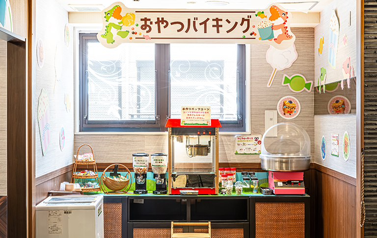 - ソフトドリンク飲み放題+おやつバイキング(ポップコーン、わたあめ、ミニスイーツ食べ放題 etc...)込み